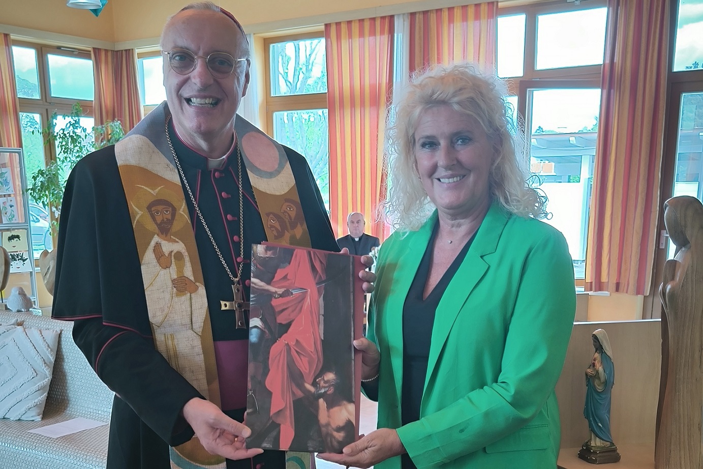 Der Tag begann mit einer feierlichen Andacht, an der sowohl Bewohner:innen als auch das Team des SeneCura Sozialzentrums Stegersbach teilnahmen. In dieser besonderen Atmosphäre teilte Bischof Ägidius Zsifkovics feierliche Worte, die besonders bei den Senior:innen auf Aufnahme stießen. Die Andacht war begleitet von Gesängen der Bewohner:innen und Mitarbeiter:innen. „Es war ein sehr bewegender Moment, als der Bischof zu uns sprach. Man spürte die Gemeinschaft – es hat uns allen sehr gutgetan“, erzählt Hildegard Rosenkranz, eine Bewohnerin des SeneCura Sozialzentrums Stegersbach. Als Zeichen der Dankbarkeit hatten die Bewohner:innen zuvor liebevoll einen Korb voll regionaler Schmankerln für den Bischof zusammengestellt, den Bewohnerin Hildegard Rosenkranz feierlich überreichen durfte. Auch der Bischof brachte ein besonderes Geschenk mit: einen Bildausschnitt des Altarbildes „Der heilige Martin“ von Joan B. Ranncher. Das Bild wurde an Haus- und Pflegedienstleitung Daniela Mitteramskogler übergeben, bevor es an seinem Platz im Haus angebracht wurde.