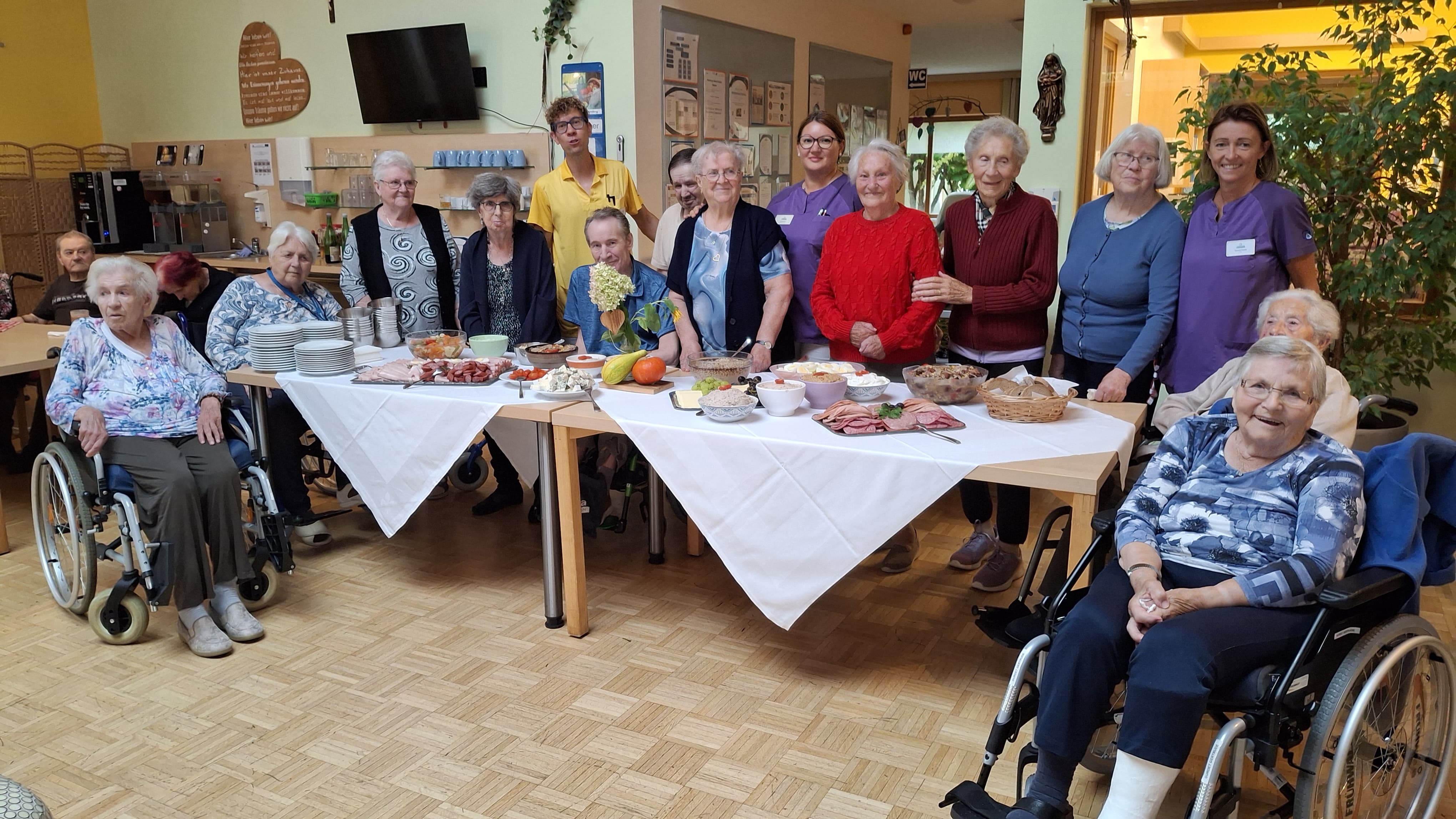Bewohnerin Frau Maria Winter, Bewohnerin Frau Paula Klobosits, Bewohnerin Frau Hildegard Rosenkranz, Bewohnerin Frau Anneliese Stifter, dahinter stehend Mitarbeiter DGKP Herr Peter Mühlhauser-Trois, davor sitzend Bewohner Herr Herbert Walitsch, rechts dahinter stehend Bewohner Herr Alfred Horvath, davor stehend Bewohnerin Frau Ilse Kratzer, Mitarbeiterin WBL Frau Astrid Kranz, Bewohnerin Frau Maria Kanz, Bewohnerin Frau Jolanta Paul, Bewohnerin Frau Herta Potzmann, Mitarbeiterin PA Frau Tamara Fabsits sowie davor sitzend die Bewohnerinnen Frau Johanna Hochwarter und Frau Gertrude Gurdet.