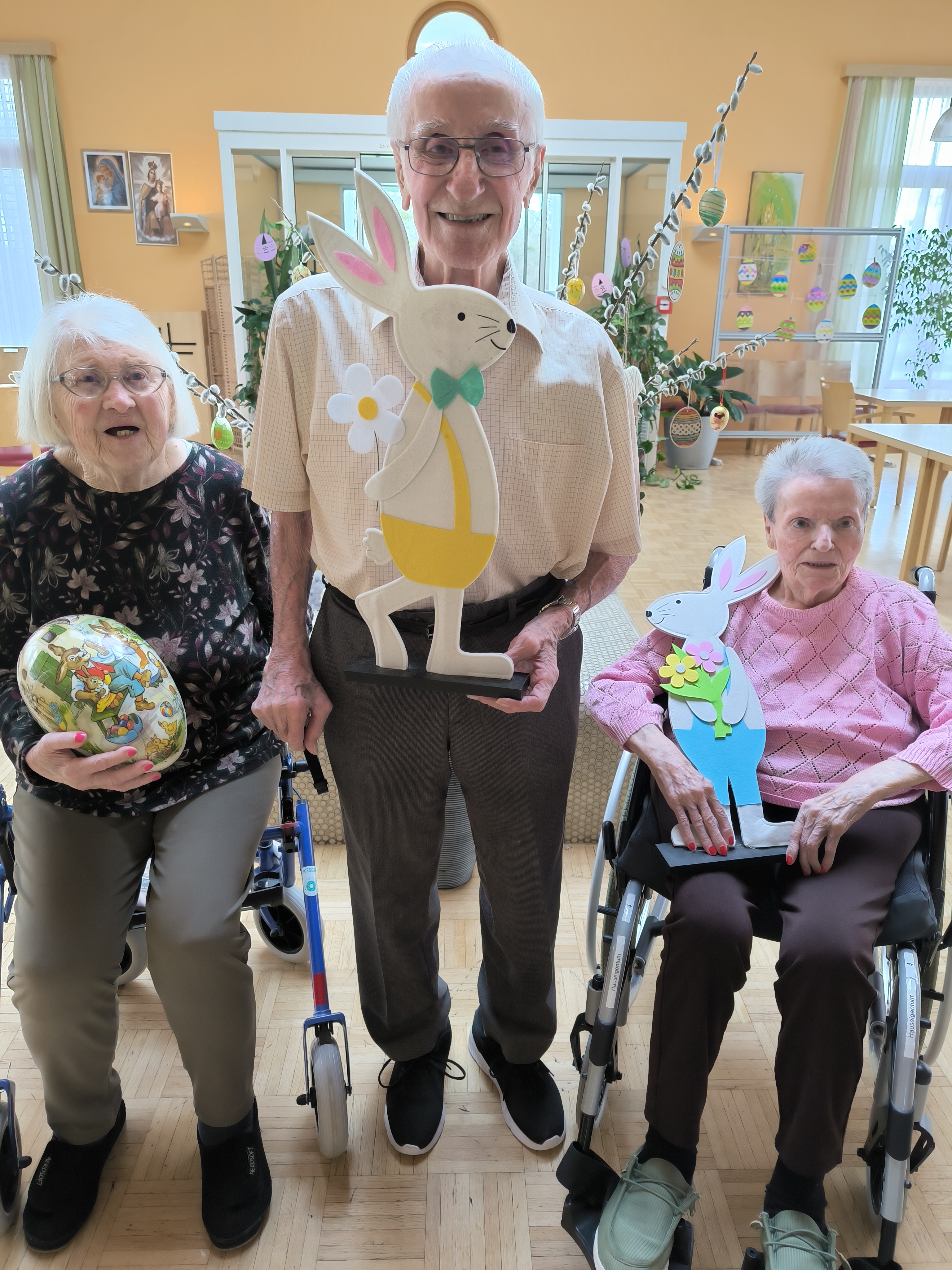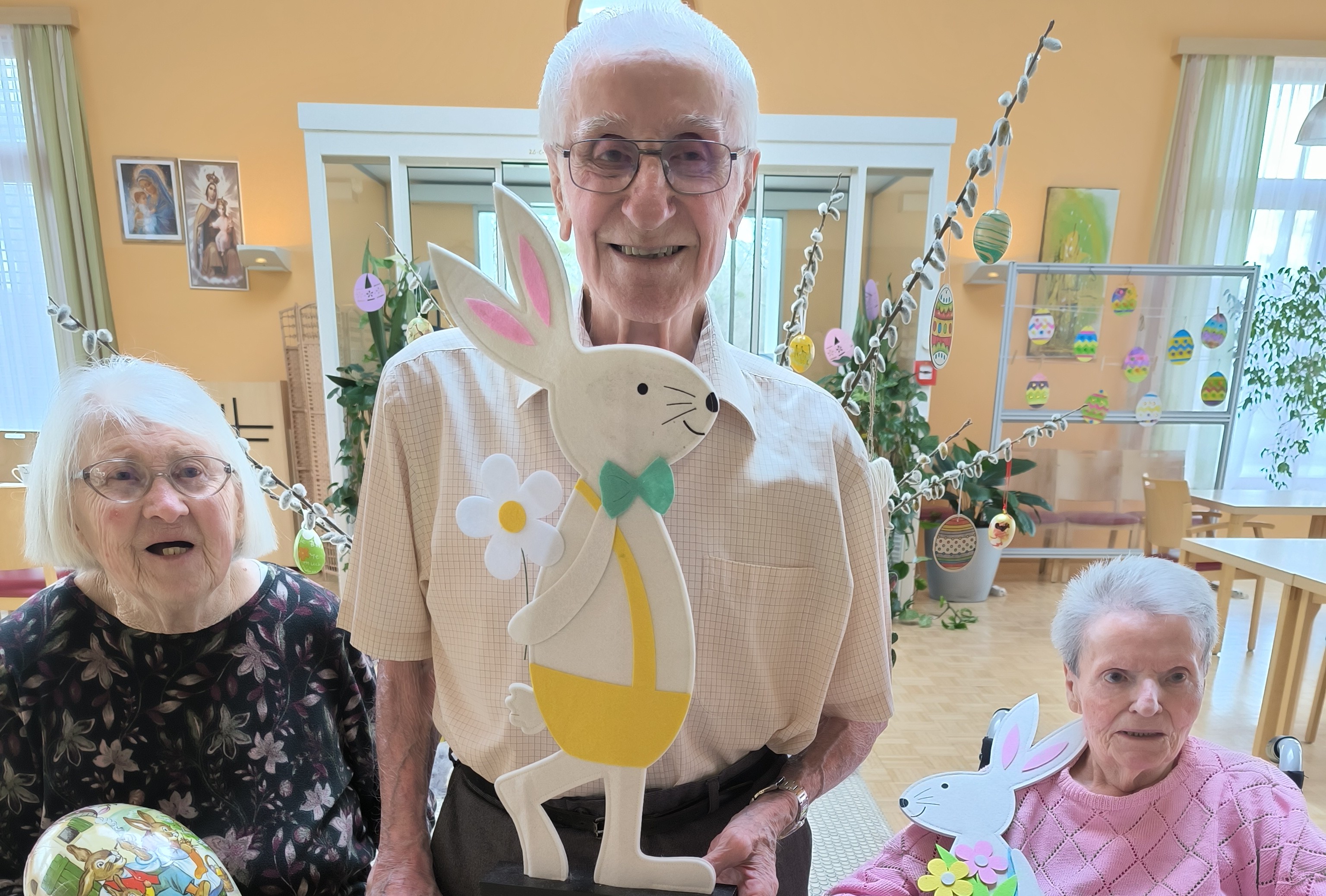Mit großer Vorfreude blicken unser Bewohner des SeneCura Sozialzentrums Stegersbach, Anton Peischl, gemeinsam mit den Bewohnerinnen Herta Potzmann und Anna Krammer dem bevorstehenden Osterfest entgegen. In gemütlicher Runde wurden bereits Ostereier bunt gefärbt und mit viel Liebe zum Detail gestaltet. Auch der Osterstrauch wurde festlich geschmückt und bringt nun frühlingshafte Stimmung in den Wohnbereich.